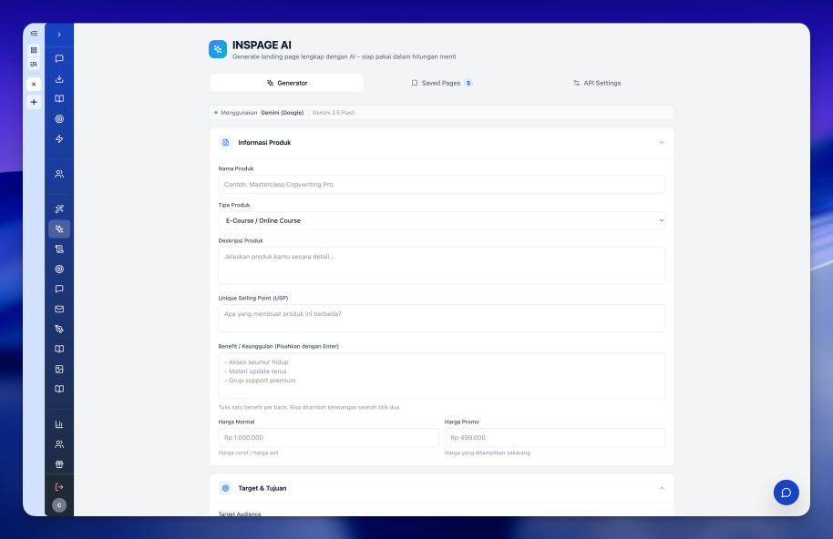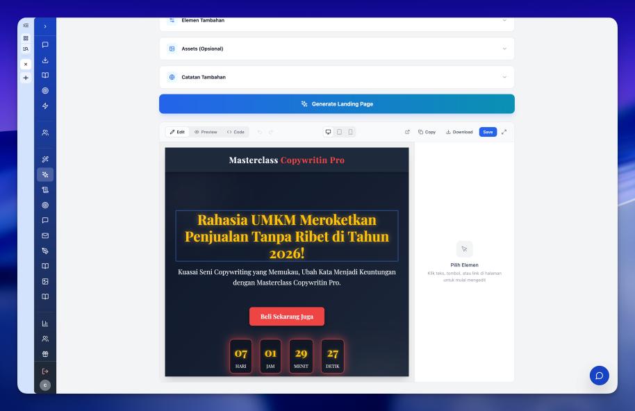 Hasilkan Landing Page profesional dan siap konversi untuk produk Anda hanya dalam hitungan menit. Tanpa ribet, tanpa biaya mahal.