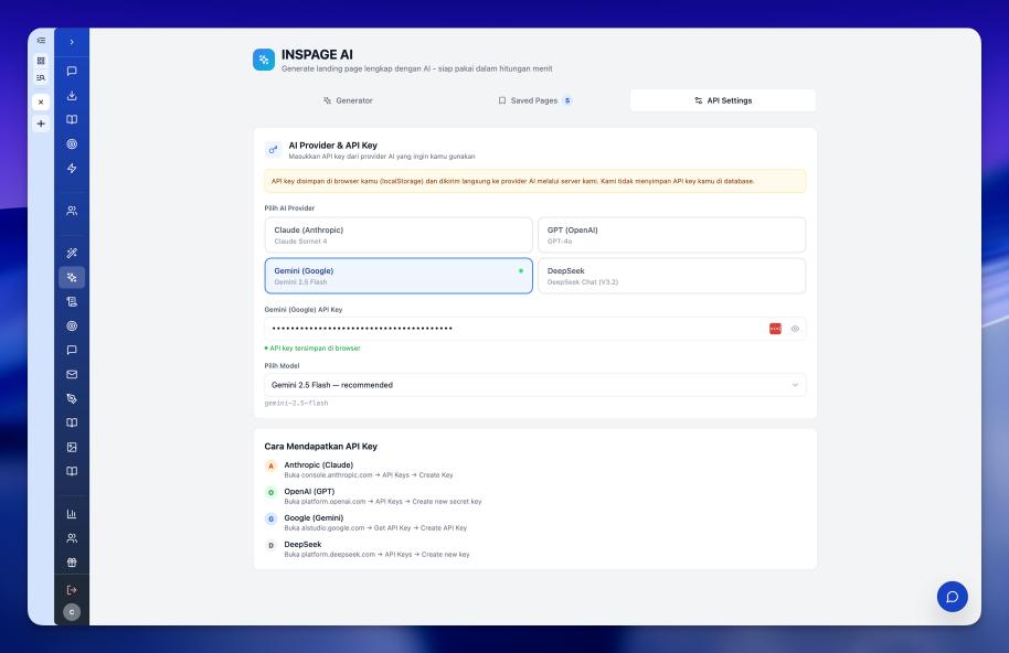 INSPAGE AI dirancang untuk penggunaan profesional. Simpan Landing Page yang sudah dibuat dan atur engine AI favorit Anda sendiri.